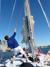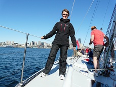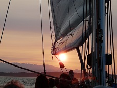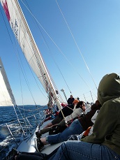 Ubytovaná už jsem, tak hurá na plachetnici. První věta, kterou hned po pozdravu na palubě slyším, mě dost překvapila. Prý vesty nepotřebujeme, protože by zavazely, ale kdo je chce, tak je má v podpalubí :). Usazuji se na přídi a hledám bezpečný bod, kde přivážu batůžek. Letíme s větrem o závod, sem tam soupeříme s plachetnicemi poblíž, náklon lodi je pořádný, vlnky šplouchají a šplouchají. Tak toto si zopáknu, a to brzy :).