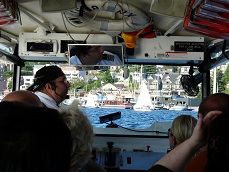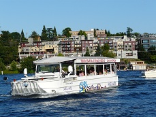 Průvodce nám udělal super show. Pouští jeden šlágr za druhým a my řveme z plných plic. Lidé v ulicích mávají. Bezvadně fungujeme jako pojízdná reklama na Starbucks. Kdykoliv na něj narazíme ozve se sborově "Chceme kafé, Starbucks!". Průvodce mění jeden klobouk za druhým, přizpůsobuje se místu, historické události, či nadcházející situaci. Do Lake Union vjíždíme-vplouváme s kapitánem Boeingu a za zvuku Queen. Míjíme několik jiných kačerů, máme smluvený pozdrav, máváme lodím a lidem na terasách housboatů. Ten modrý hrál ve filmu Samotář v Seattlu a Tom Hanks na terase vysedával. Sem tam přistane nebo vzlétne hydroplán, do toho kajakáři a jachtaři a jezerem brouzdá i krásný parník. Vše v pohodě funguje...